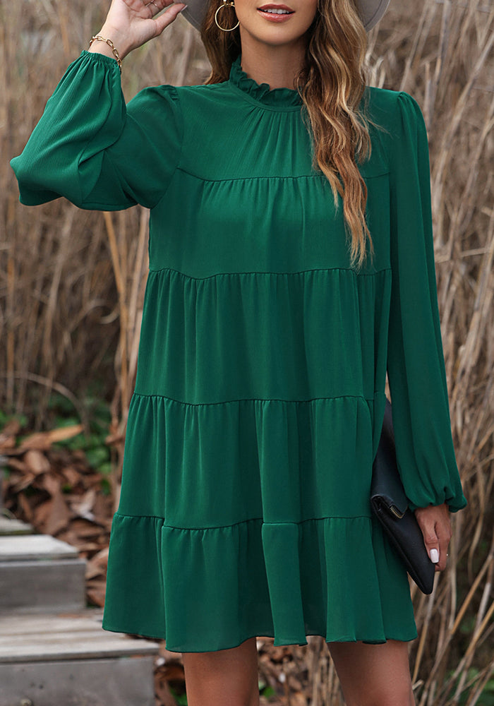 Green Puff Sleeve Mock Neck Back Knot Tiered Dress
