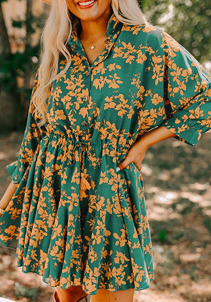 Green Floral Print Drawstring Tunic Flowy Short Dress