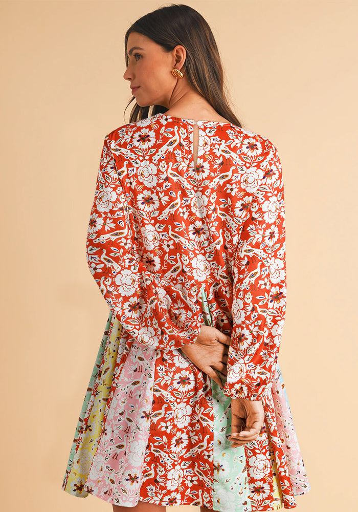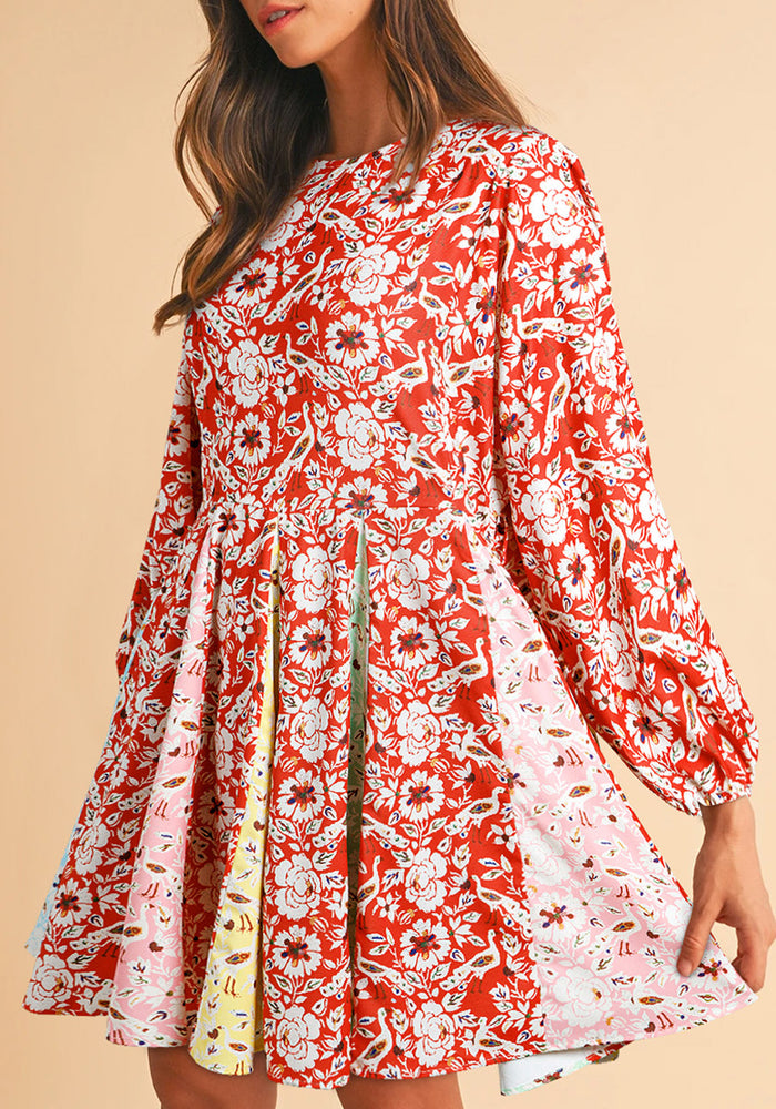Red Colorful Floral Patchwork Long Sleeve Pleated Mini Dress
