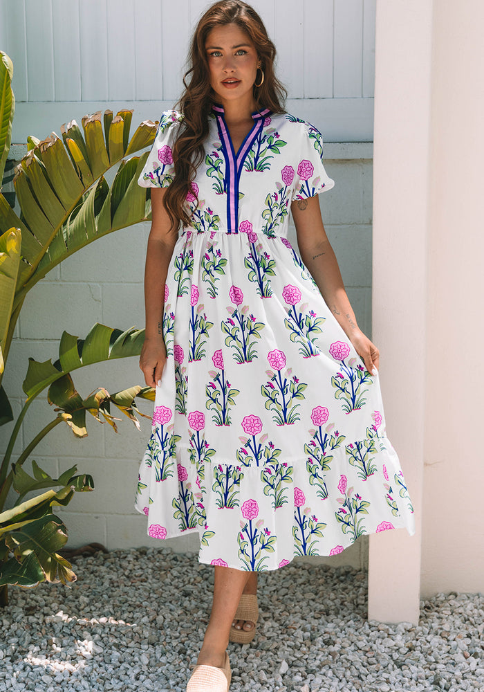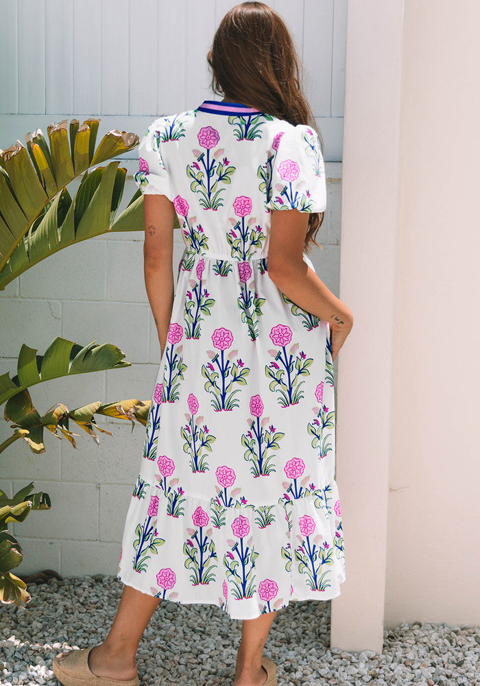 White Floral Puff Short Sleeve V Neck High Waist Maxi Dress