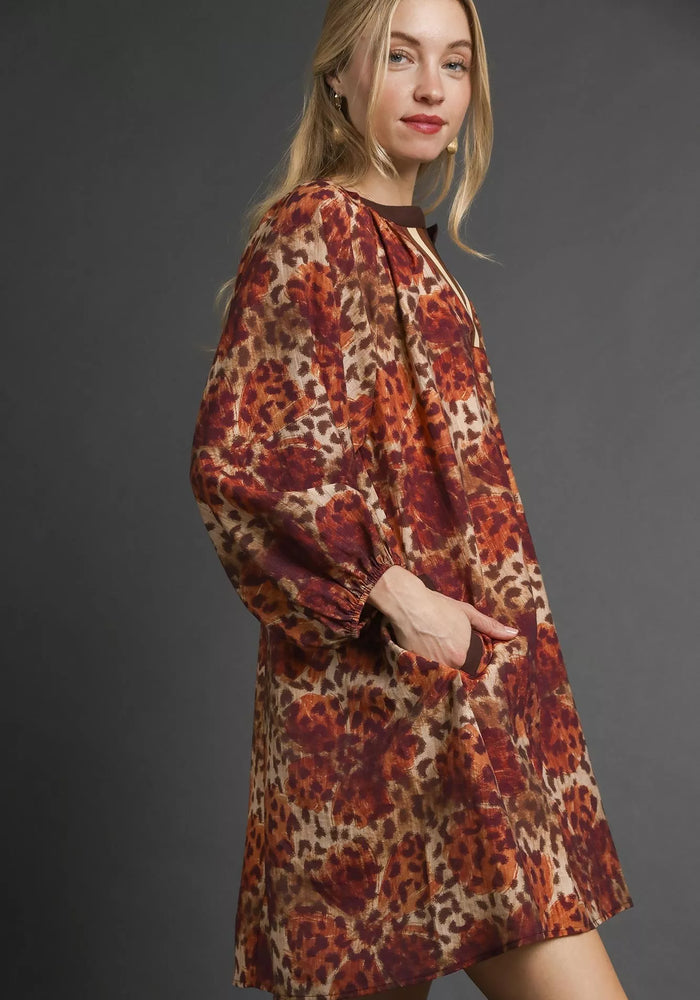 Umgee Animal Print Boho Tunic Dress with Contrast Trim Detail