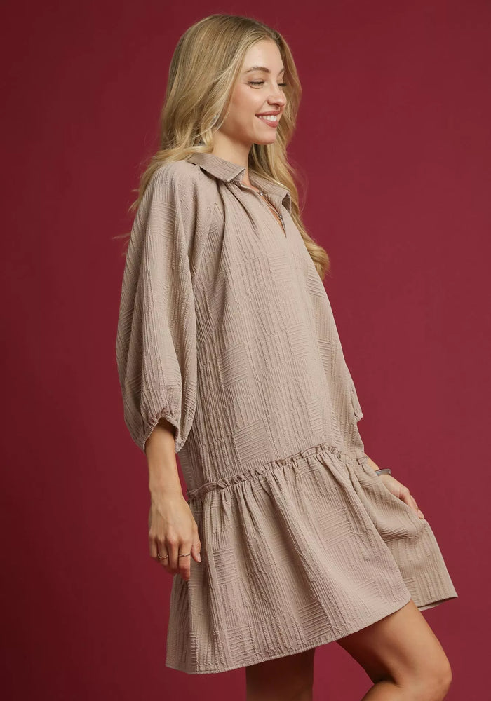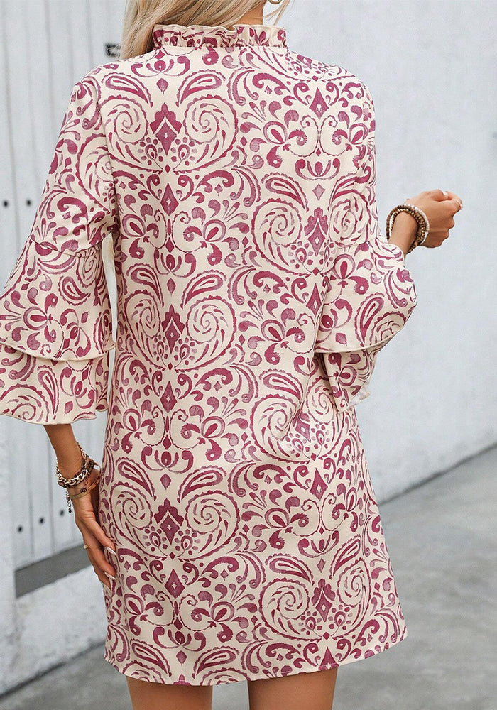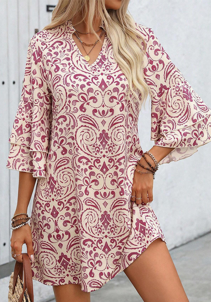 Pink Paisley Print Tiered 3/4 Sleeve Notched Neck Mini Dress