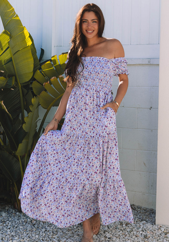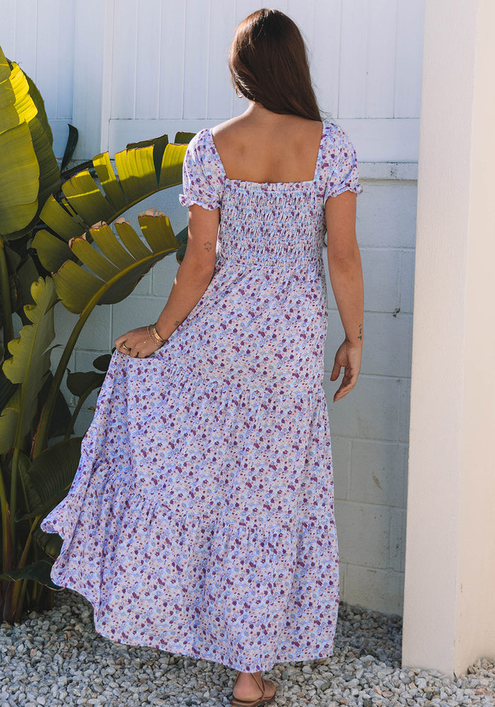 Purple Floral Short Bubble Sleeve Shirred High Waist Maxi Dress
