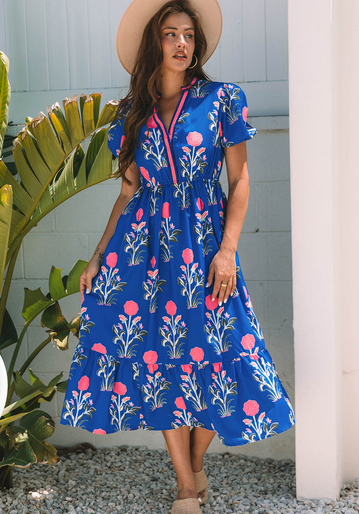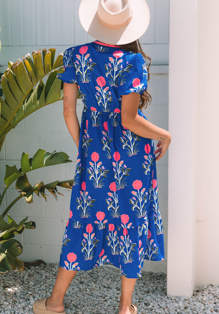 Sky Blue Floral Puff Short Sleeve V Neck High Waist Maxi Dress