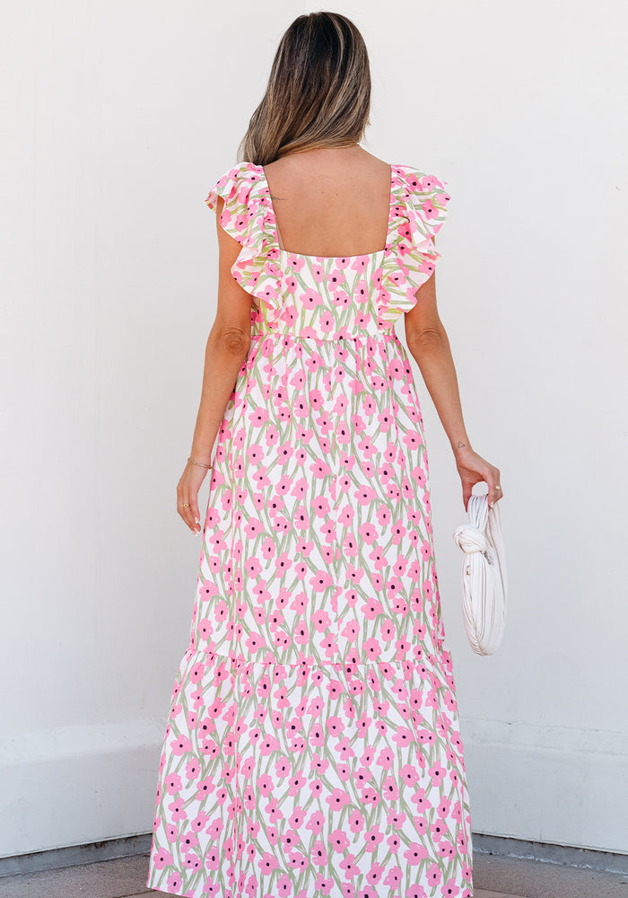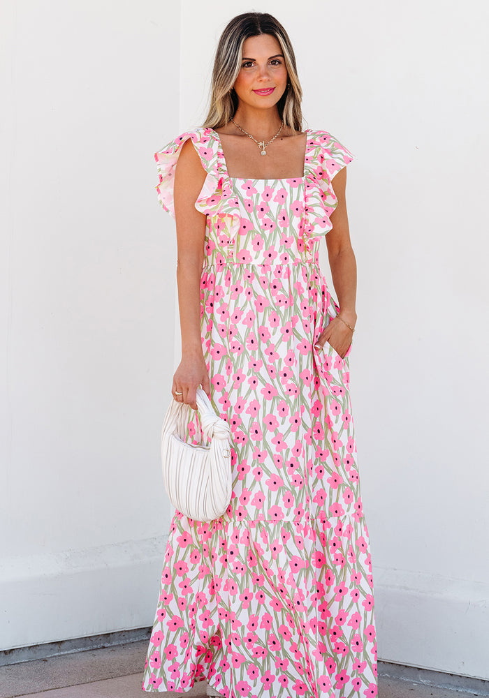 Pink Floral Print Square Neck Ruffled Strap Maxi Dress