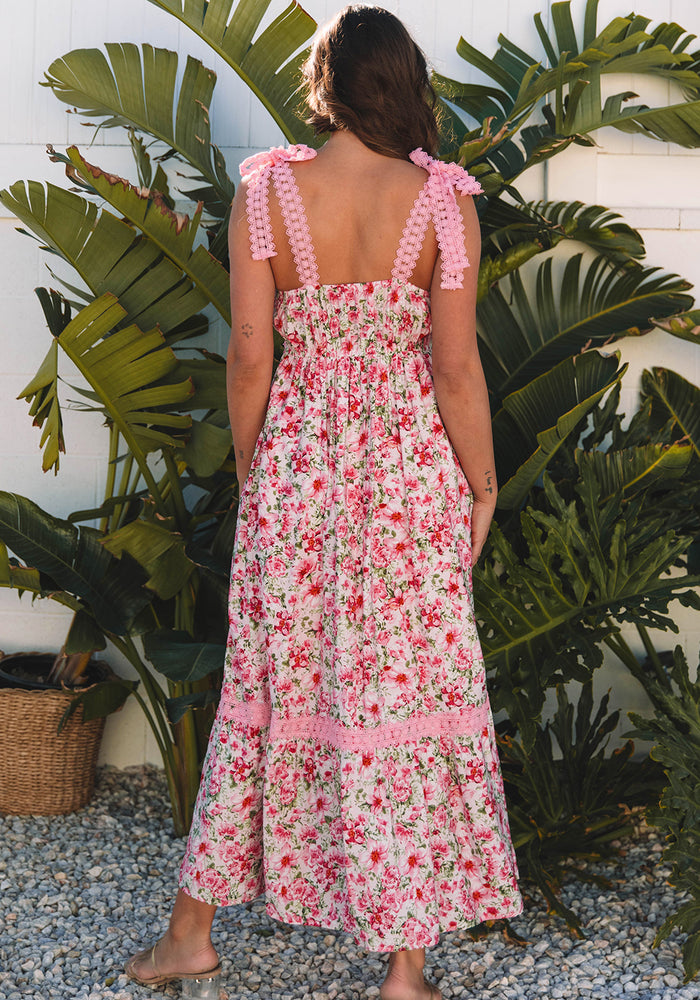 Pink Floral Lace Tied Strap Empire Waist Maxi Dress