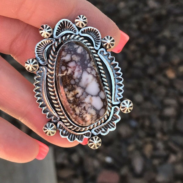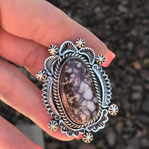 Sterling Silver Wild Horse Ring Sz 5.5. Gorgeous Matrix and Colors in this Wild Horse Stone. Set in Sterling Silver. Measuring 2 inches long and just under 1 1/2 inches wide. Intricate Silversmith detail. Created and signed by Artist Harris J. Stamped Sterling. Very cool ring.