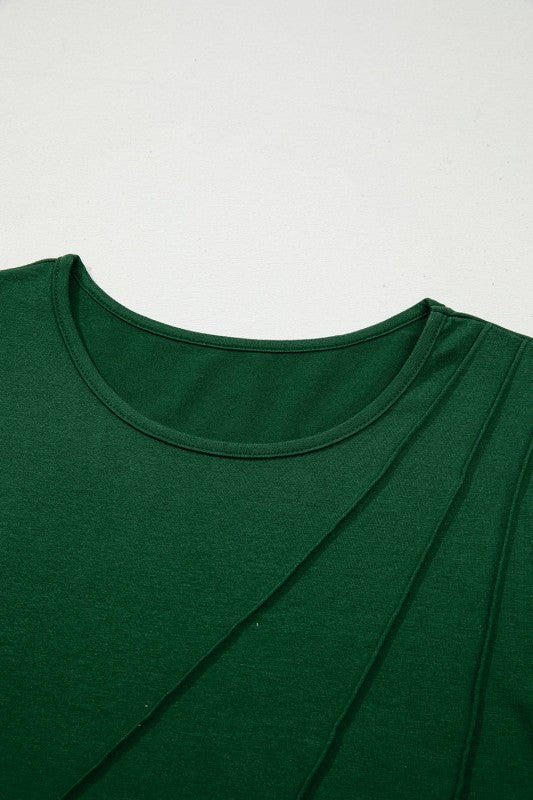 This top brings playful charm to your wardrobe with its sleek and unique asymmetric seam detail. Perfect for layering or rocking on its own, its round neck design keeps it classic yet fun. Dress it up or down—either way, it’s your new go-to for effortless style! Polyester/Cotton/Spandex