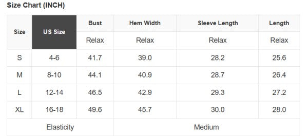 See size chart for approximate measurements.