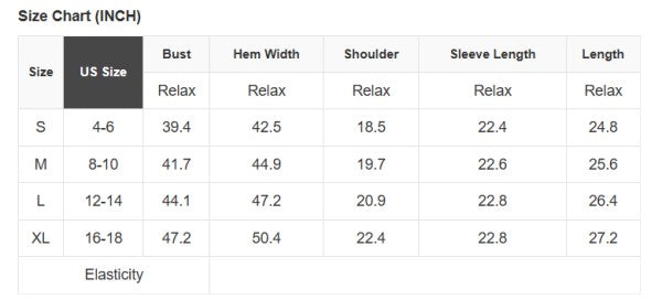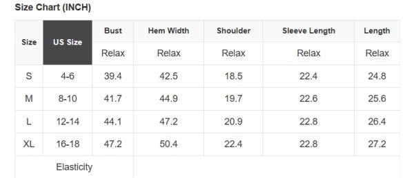 See size chart for approximate measurements.