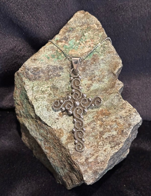 An ornately decorated cross pendant that evokes memories of old-world Taxco. Measuring: 2 1/2\" x 1 1/4\"