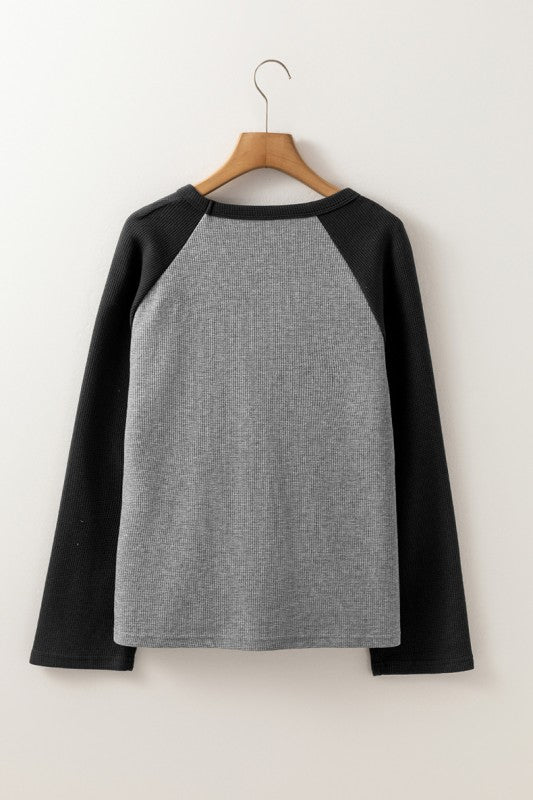Waffle Knit Colorblock Patch Graphic Raglan Top