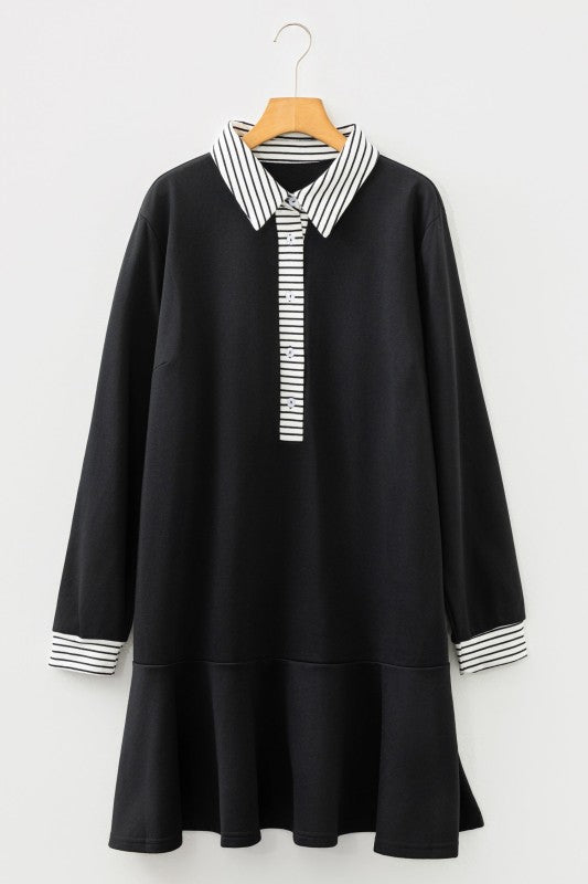 Plus Size Stripe Cuffs Collared Ruffle Hem Dress