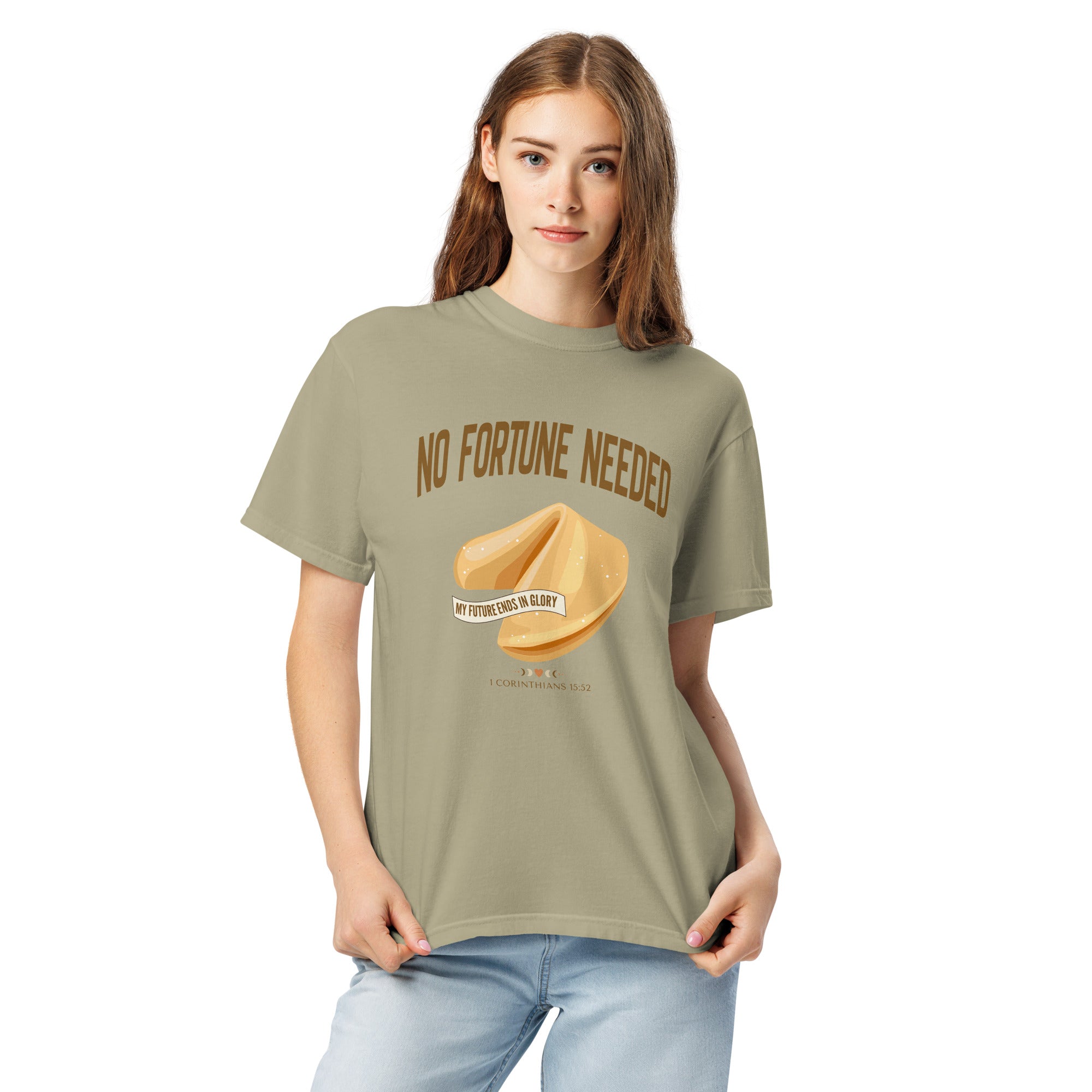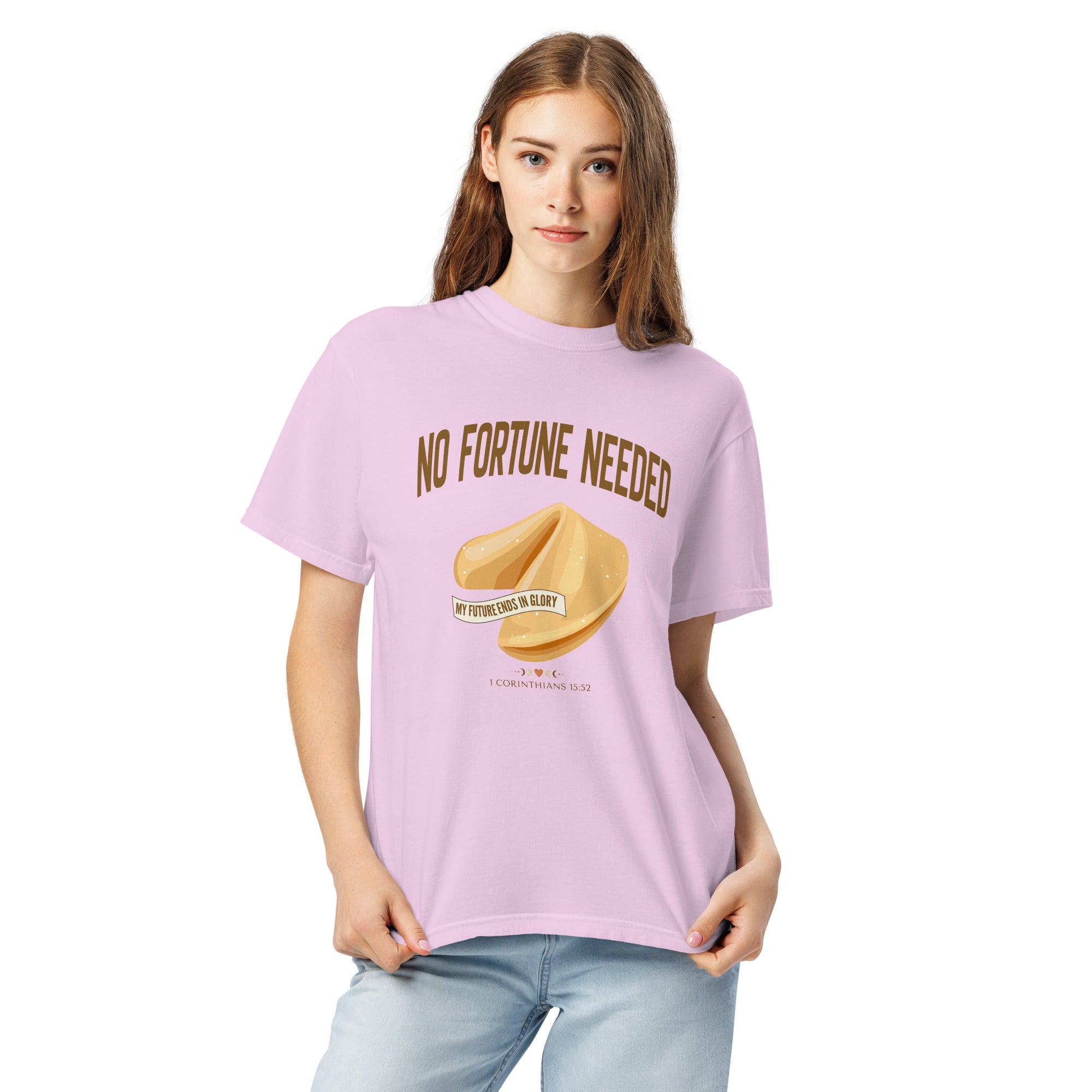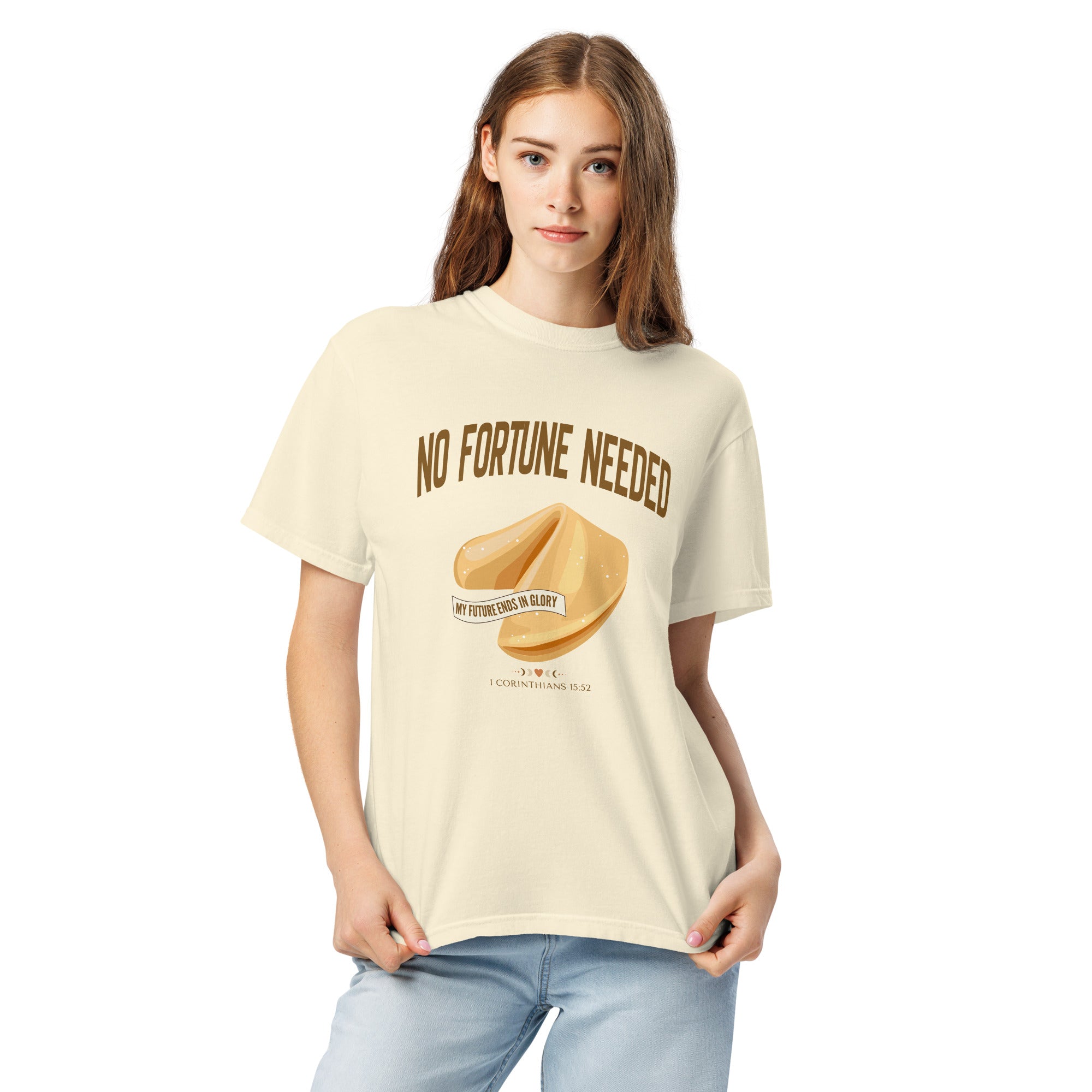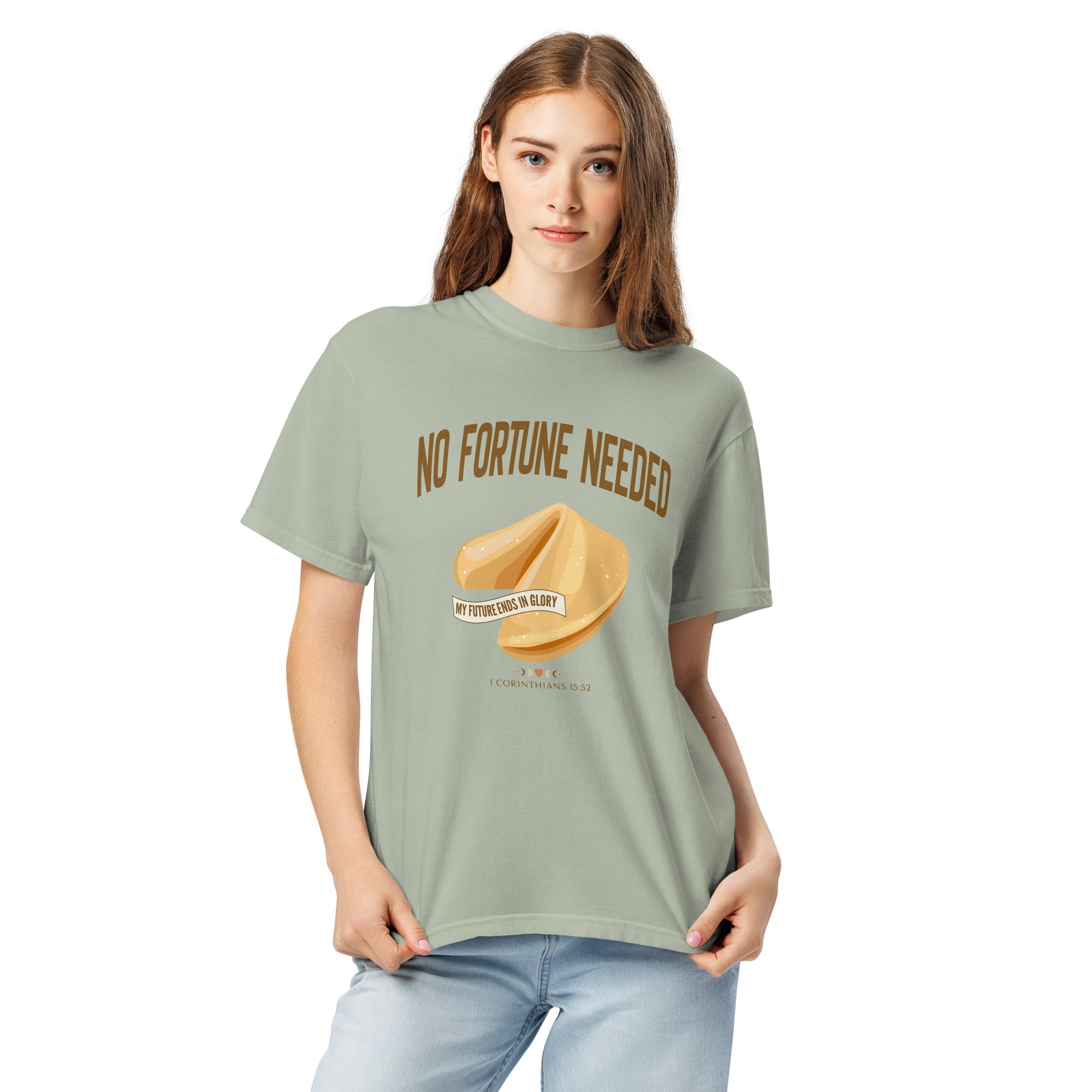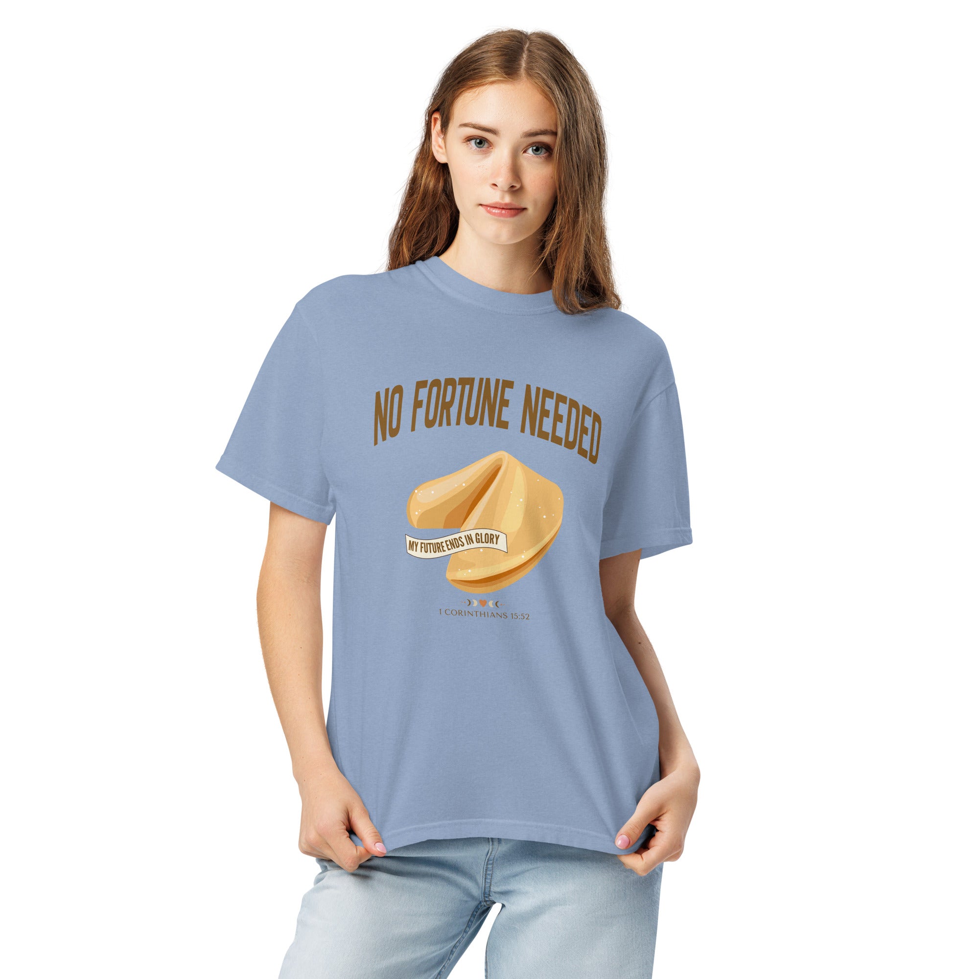 This faith-forward design flips the script on the world's idea of "luck." With a beautifully illustrated fortune cookie and a banner that reads My Future Ends in Glory, this tee is a bold, hope-filled reminder that your future is secured in Christ - no guessing, no hoping for the best, no 'good vibes only.' Just truth.