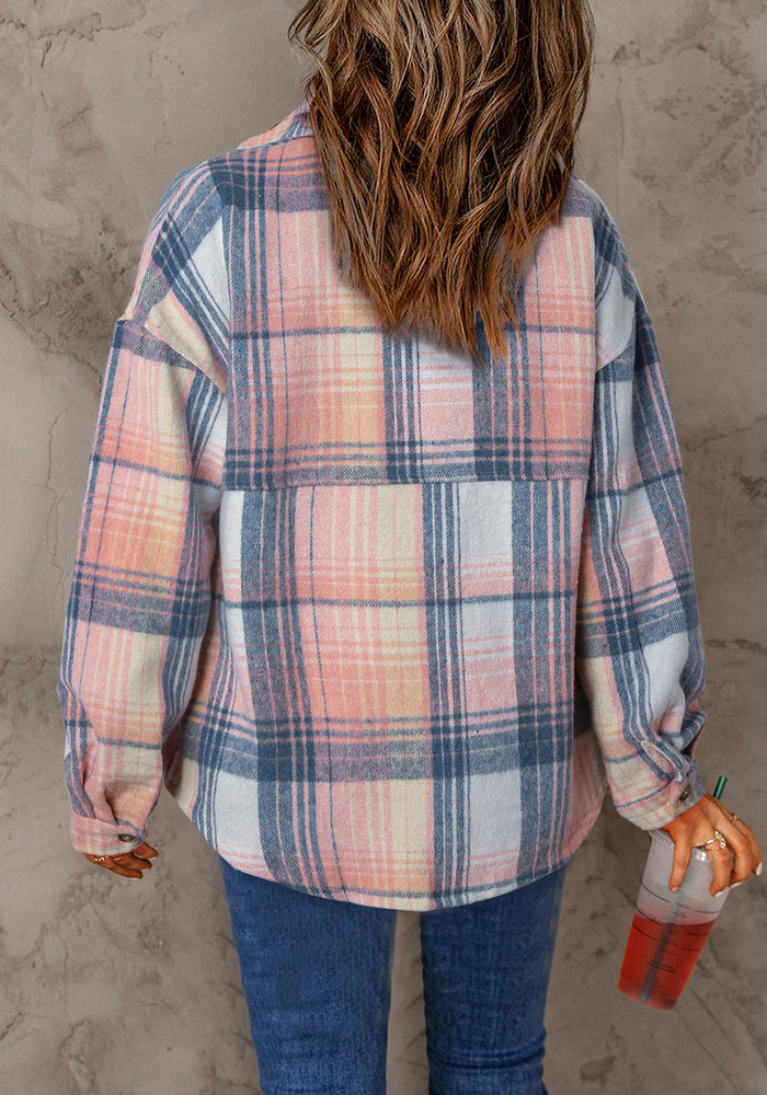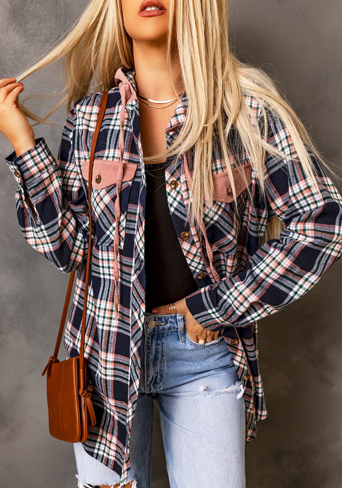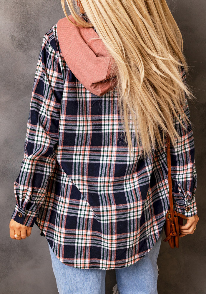 Pink Contrast Hooded Drawstring Plaid Shacket