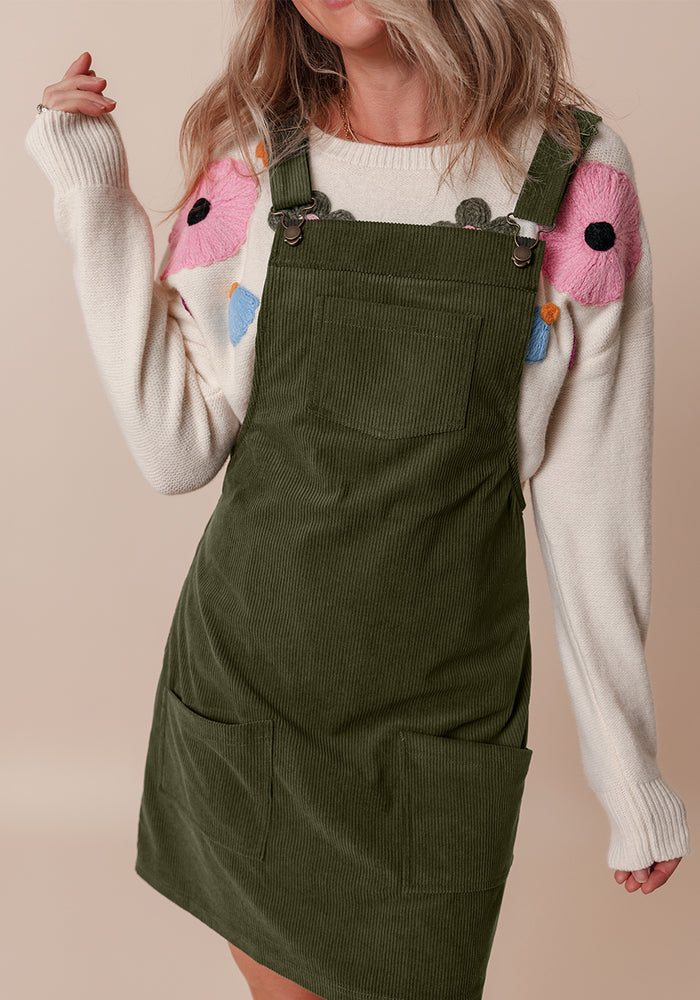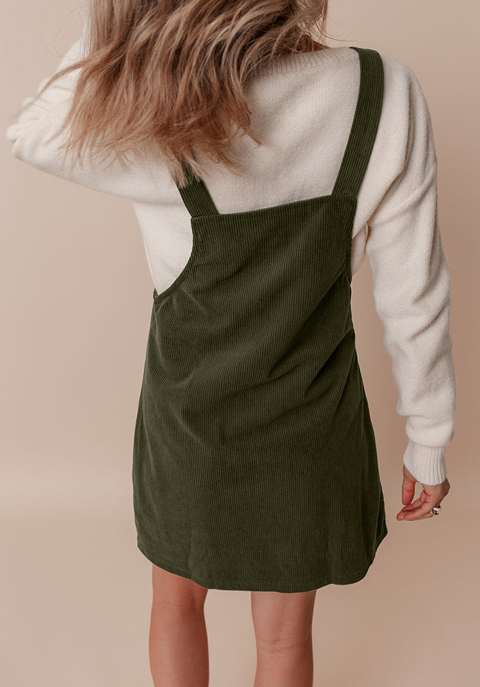 Vineyard Green Solid Front Pockets Sleeveless Corduroy Overall Dress
