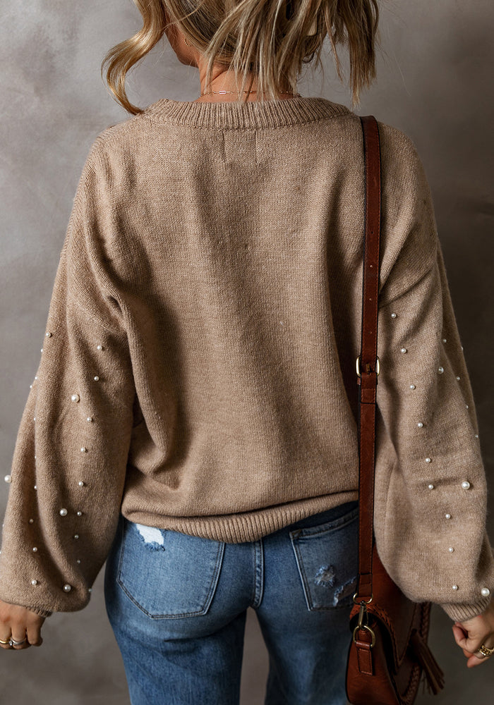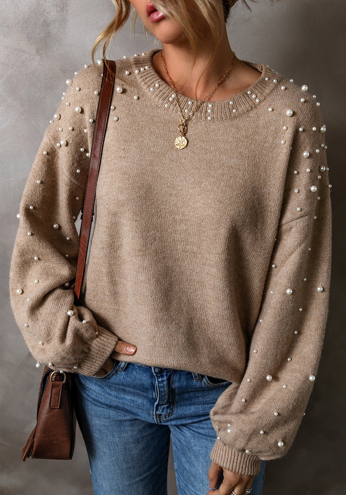 Smoke Gray Pearled Drop Shoulder Round Neck Sweater