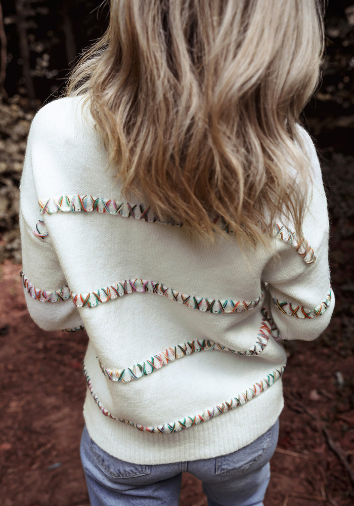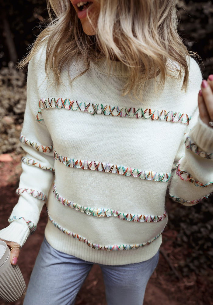 White Colorful Crossed Stitch Drop Shoulder Sweater