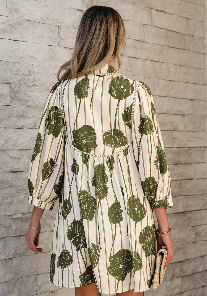 Guacamole Green Floral Striped Print Contrast Piping Puff Sleeve Dress