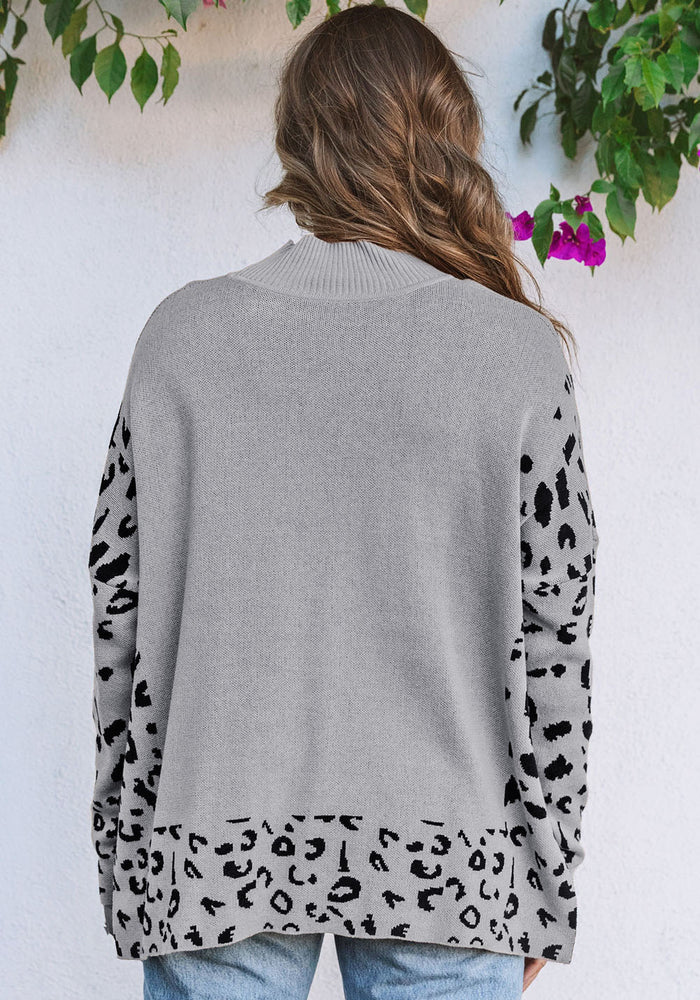 Gray Leopard High Neck Side Slit Oversized Sweater