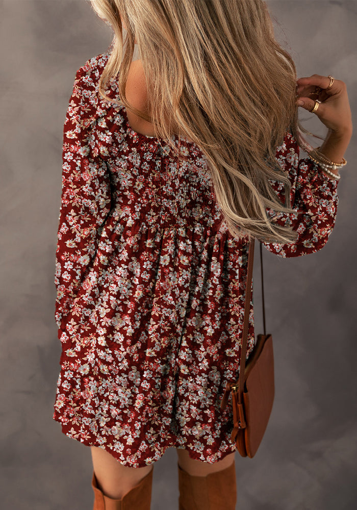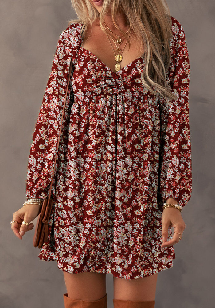 Red Floral Print Sweetheart Neck Shirred Back Mini Dress