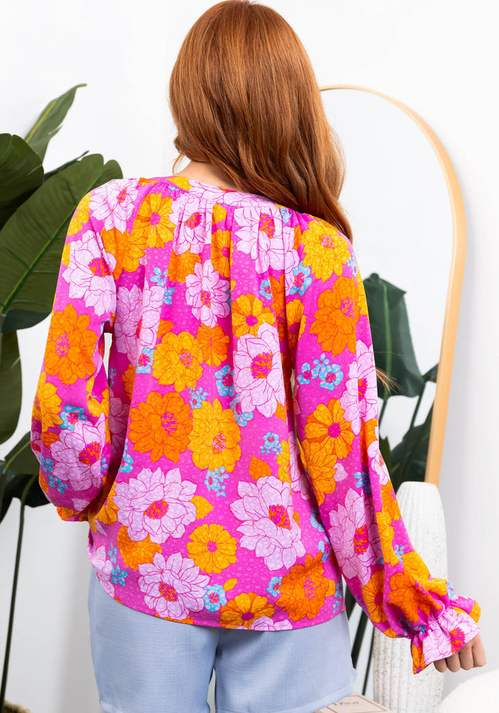 Rose Floral Print Flounce Sleeve Notched Neck Blouse