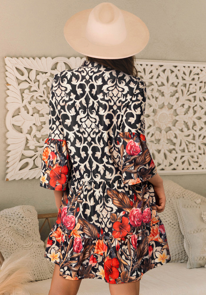 • Black Retro Floral Mixed Print Split Neck A-line Dress