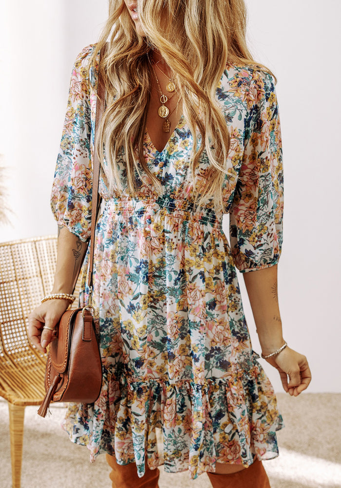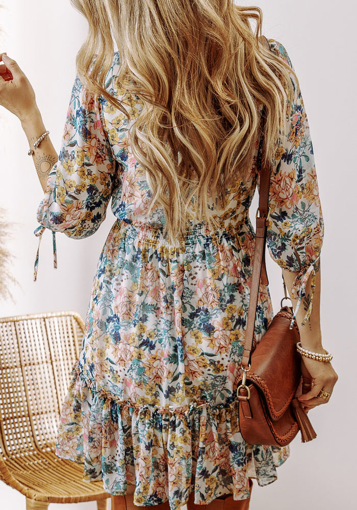 • Sky Blue Floral 3/4 Sleeve V Neck High Waist Ruffled Dress