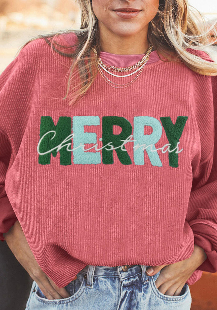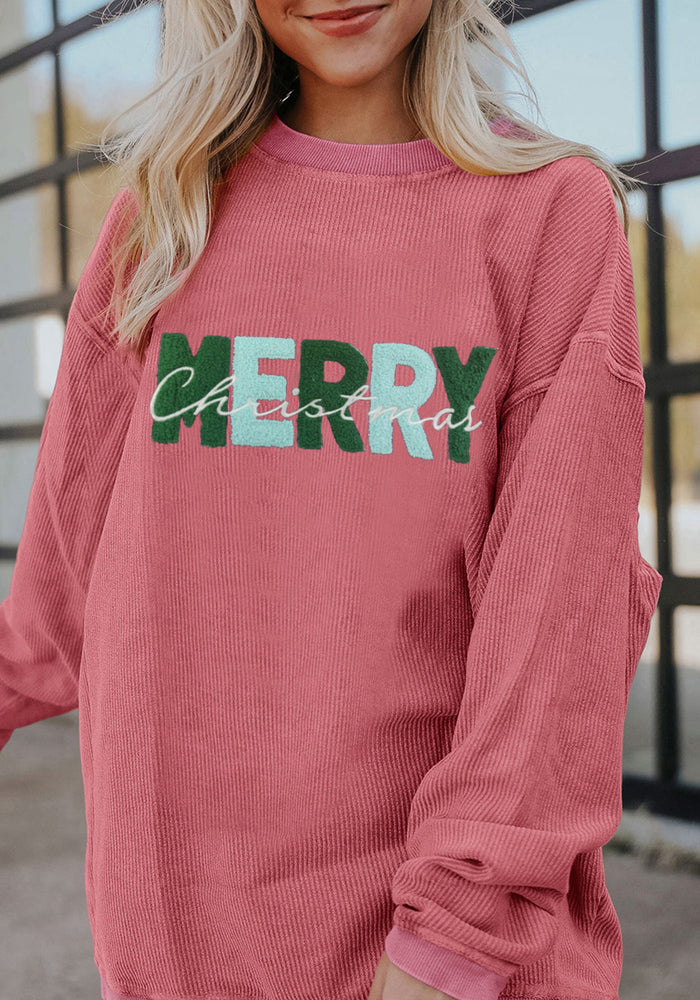 Strawberry Pink MERRY Christmas Chenille Embroidered Corded Sweatshirt