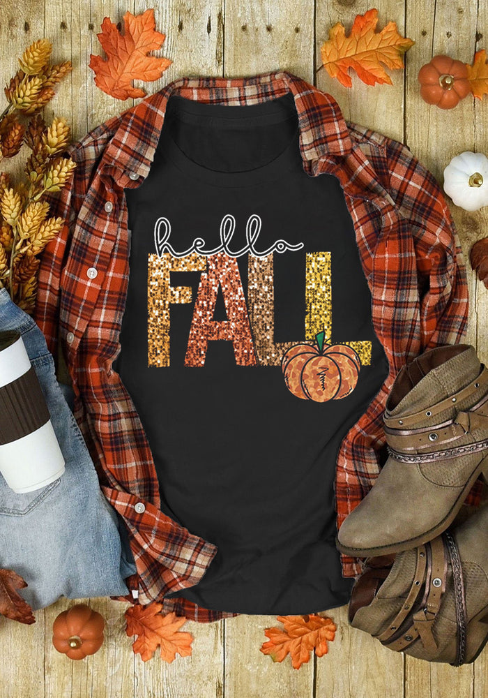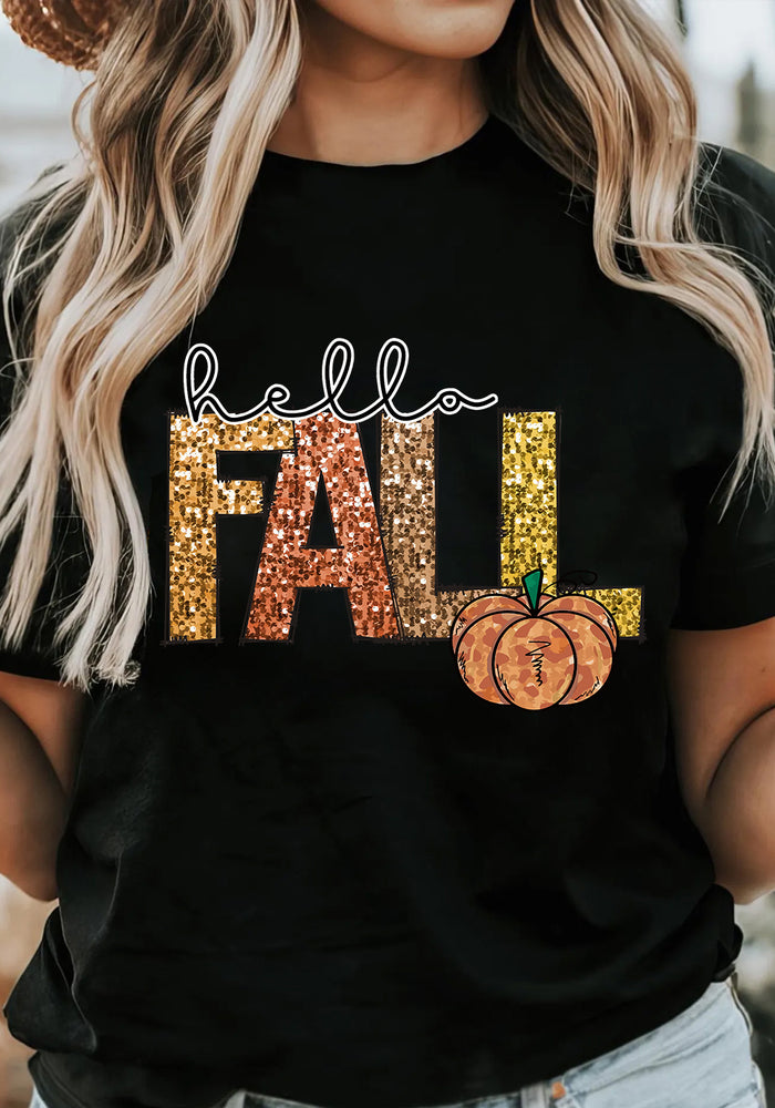 Black Hello Fall Letter Pumpkin Printed Thanksgiving T Shirt