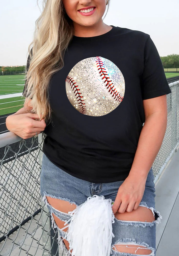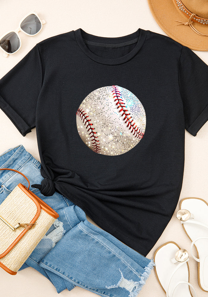Black Heat Transfer Baseball Print Cotton Blend T Shirt