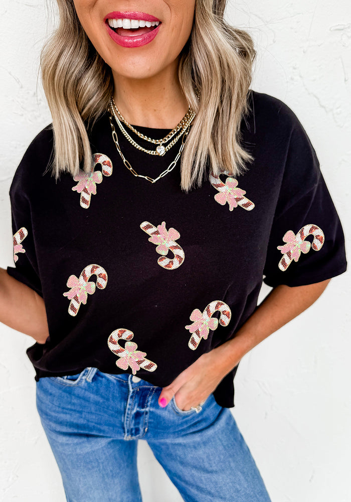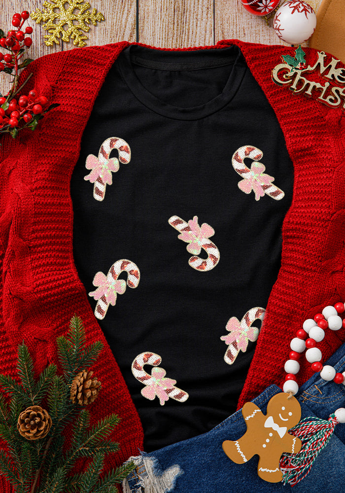 Black Sequined Candy Cane Patched Pattern Holiday T Shirt