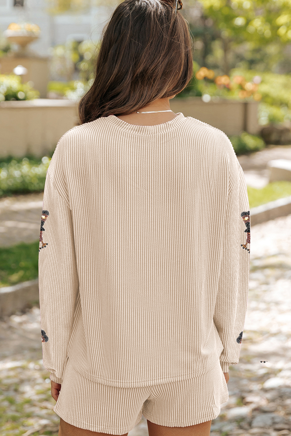 - The festive shorts set includes a long-sleeve top and matching shorts.