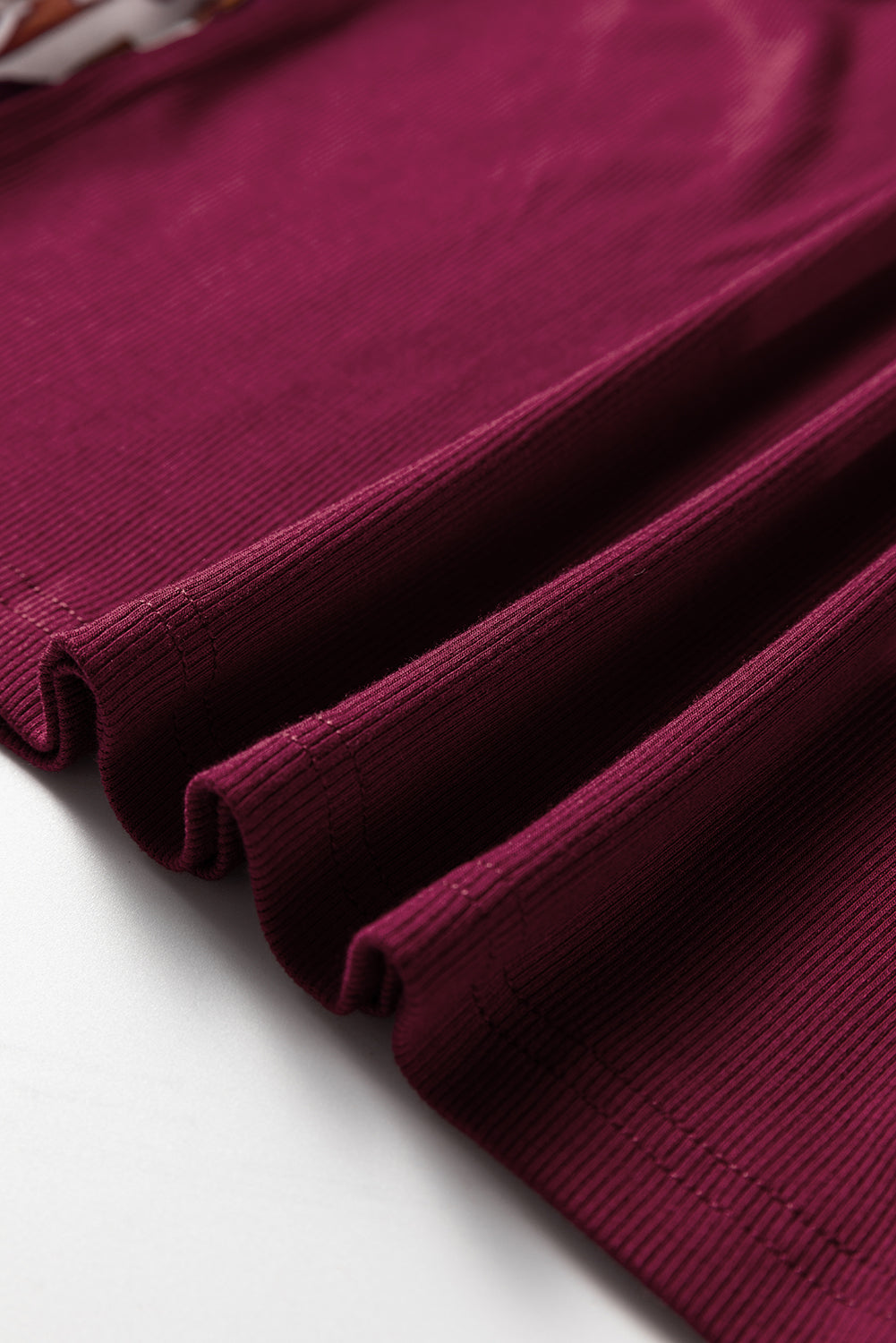 This long sleeve top features a solid ribbed body patchwork with floral sleeves.