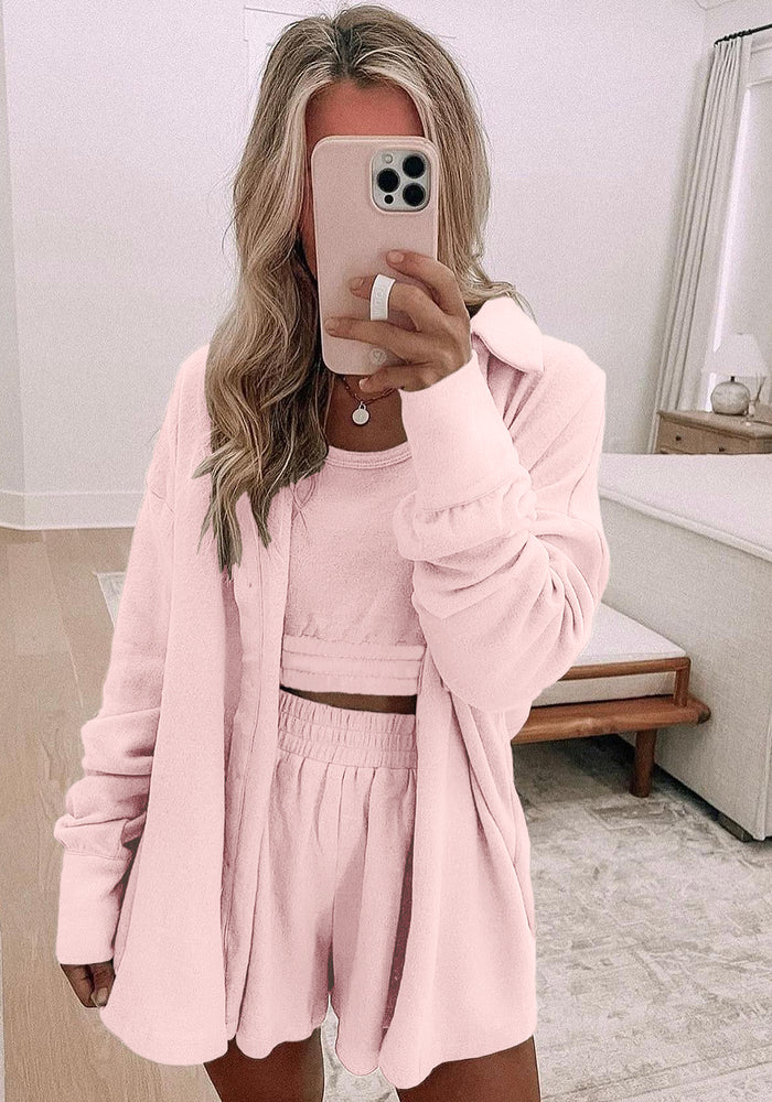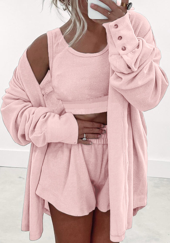 Light Pink 3 Pcs Crop Tank Top Shorts with Cardigan Lounge Set