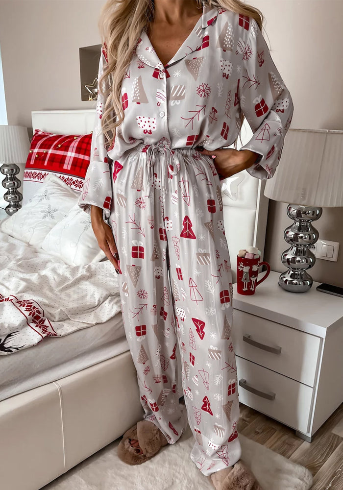Light Grey Christmas Printed Shirt and Pants Pajama Set