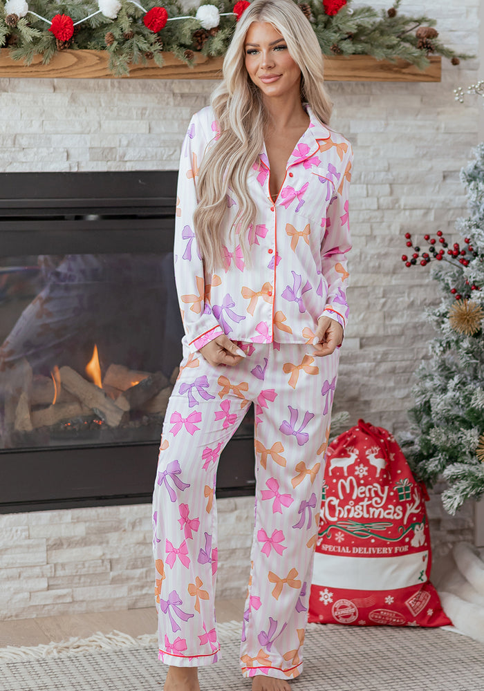 Pink Striped Bow Print Contrast Piping Trim Shirt and Pants 2pcs Pajama Set