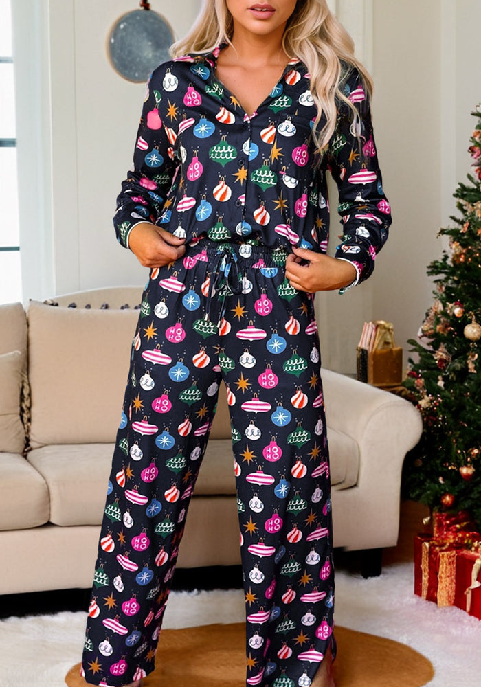 Navy Blue Colorful Christmas Lights Print Shirt and Pants Pajama Set