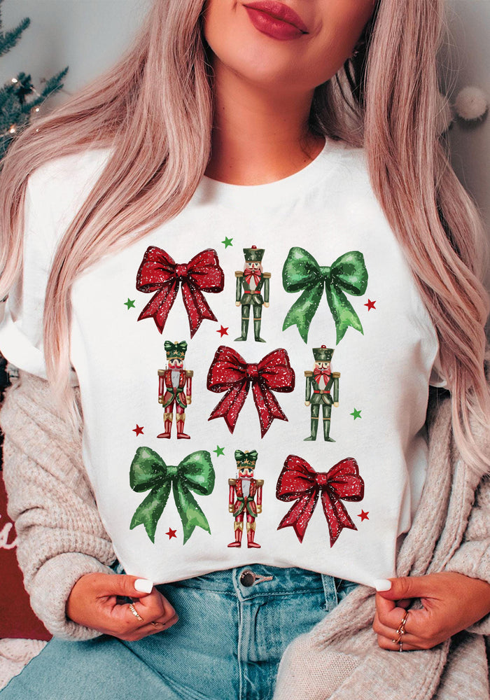 White Bowknot Nutcracker Printed Crewneck Christmas T Shirt