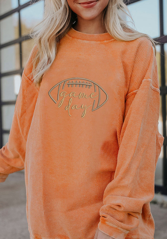 Orange Rugby Game Day Embroidered Corduroy Sweatshirt
