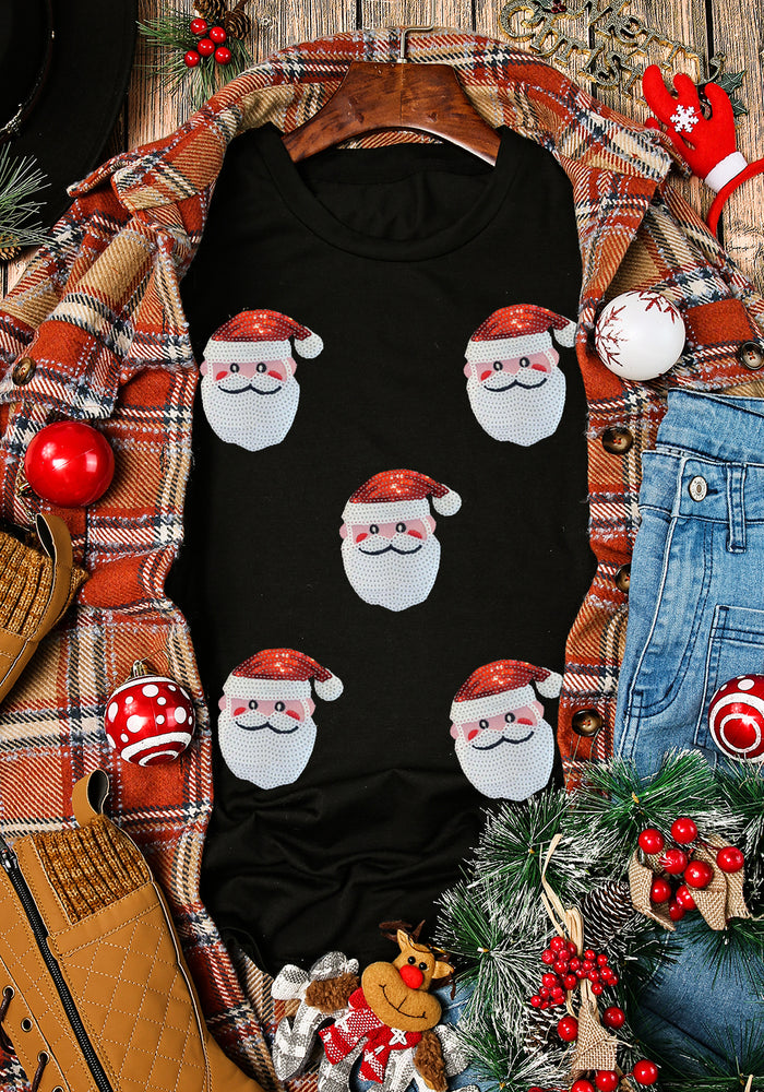 Black Faux Sequin Christmas Claus Pattern Crewneck T Shirt