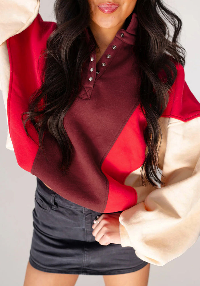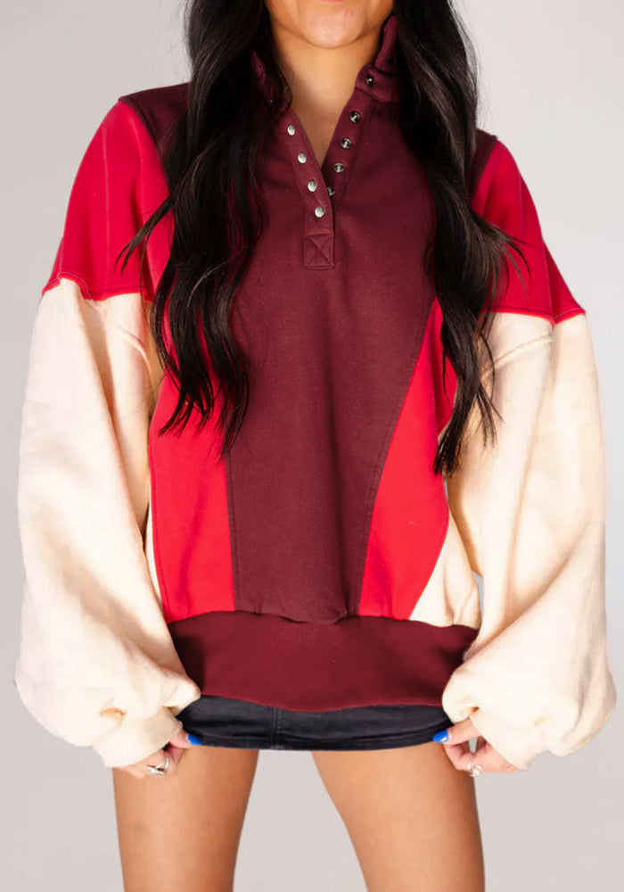Fiery Red Color Block Patchwork Snap Button Oversize Hoodie