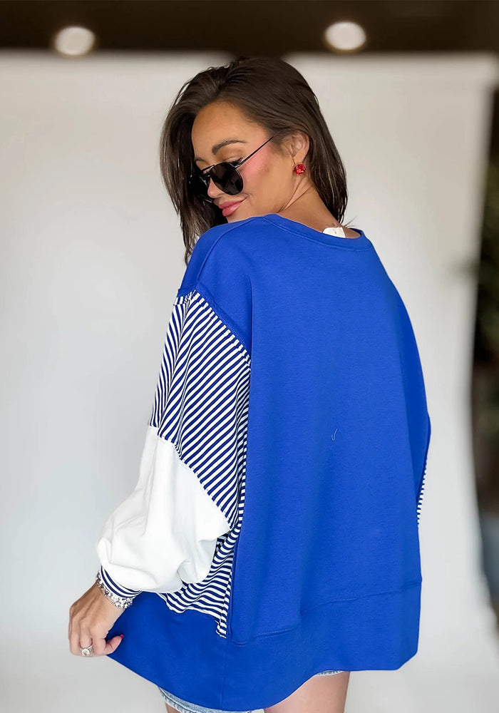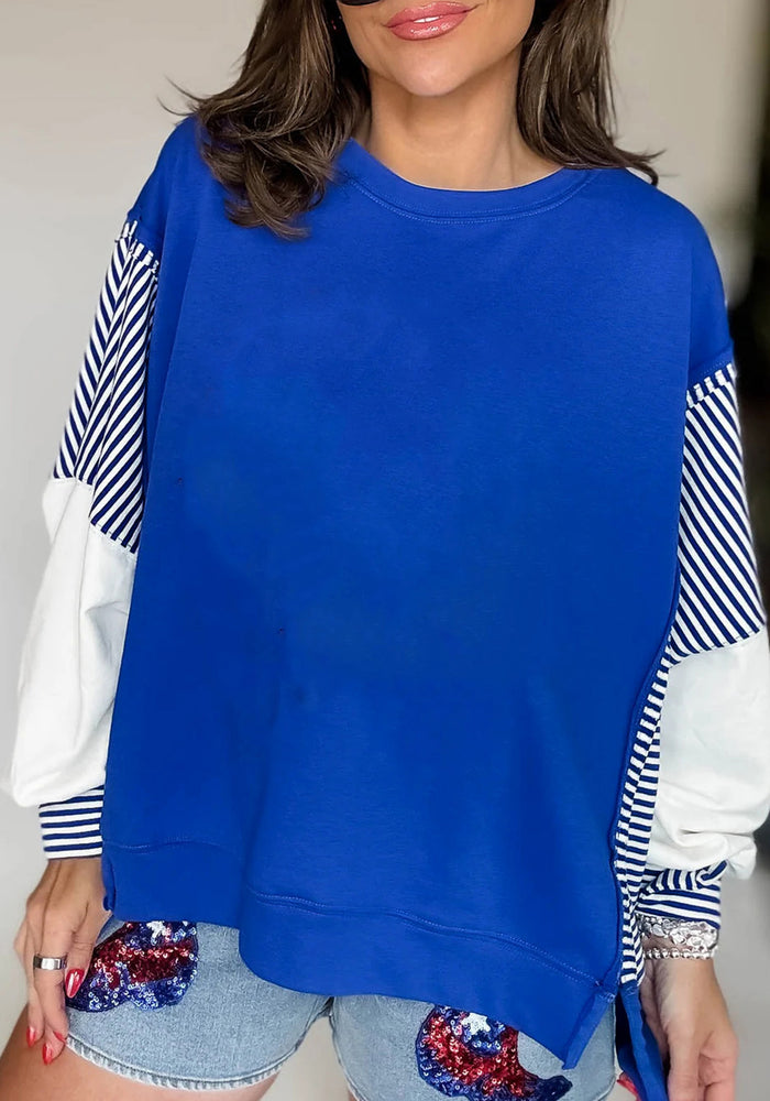 Dark Blue Striped Patchwork Sleeve Colorblock Sweatshirt
