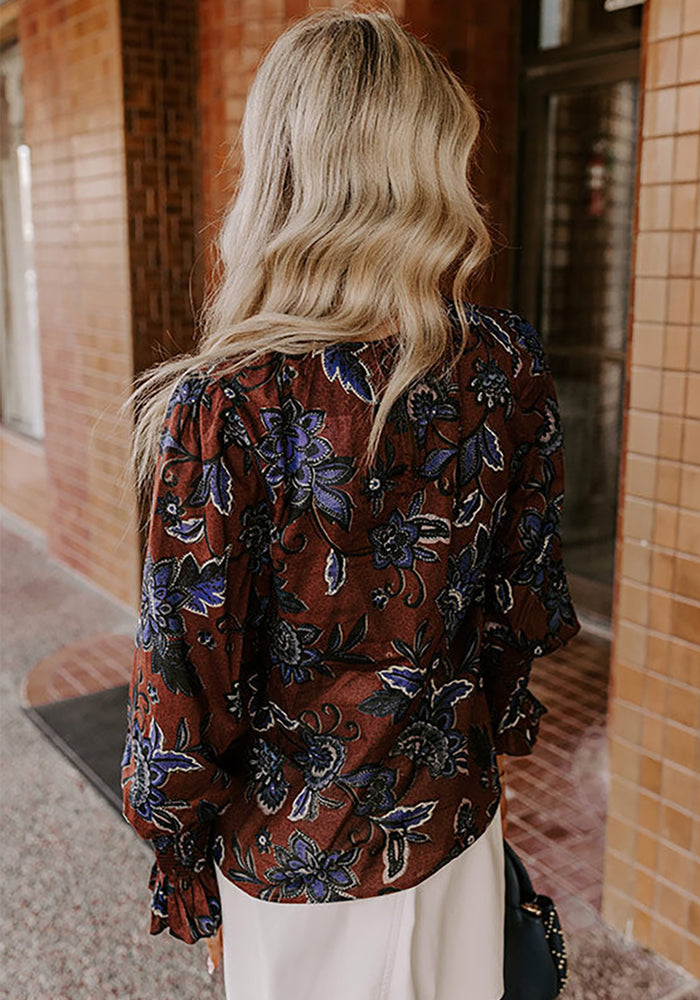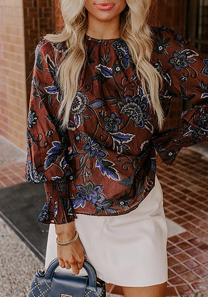 Brown Autumn Floral Print Smocked Cuffs Shift Blouse