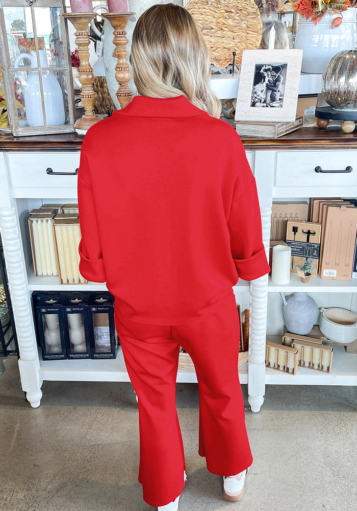 Fiery Red Polo Collar V Neck 3/4 Sleeve Pullover Drawstring Bell Bottom Pants 2pcs Set