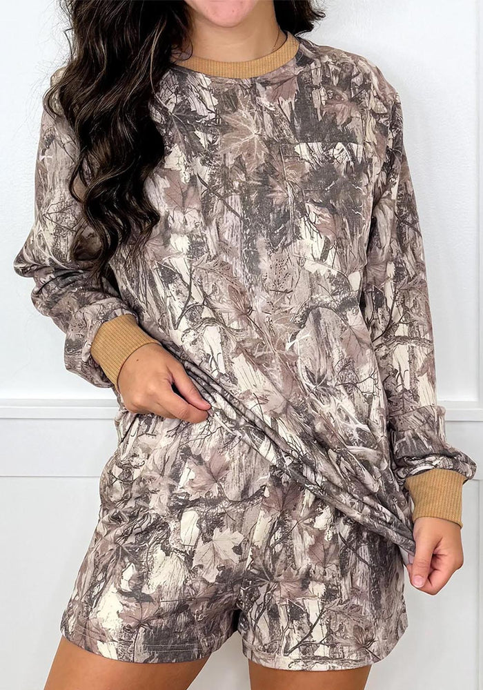 Khaki Woodland Camo Print Long Sleeve Top Casual Short Set
