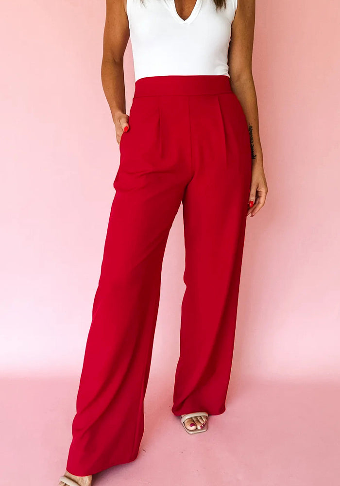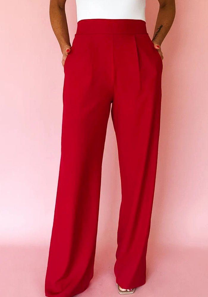 Fiery Red Pleated Detail Pull On High Elastic Waist Loose Straight Pants