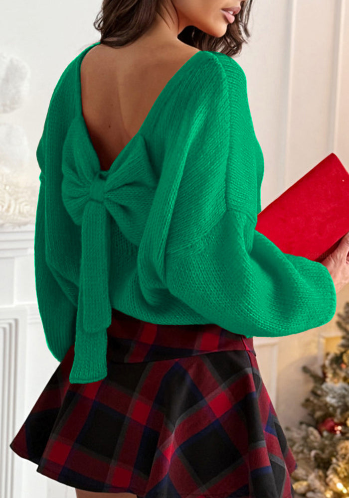 Bright Green Festive Bow Backless Bubble Sleeve Sweater
