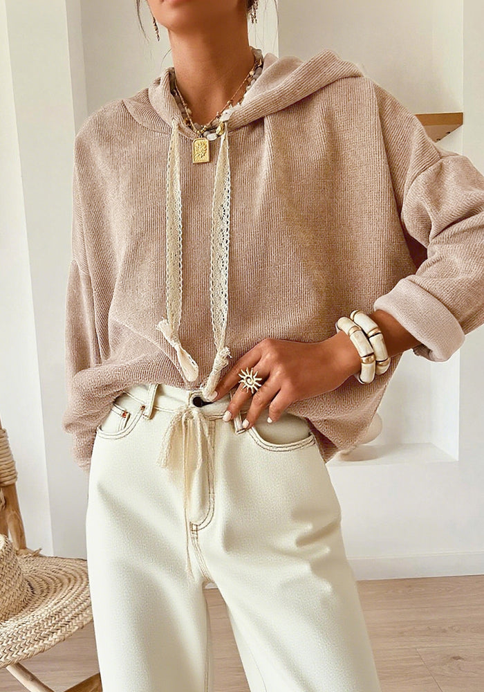 Casual Thermal Textured Lace Drawstring Baggy Hoodie