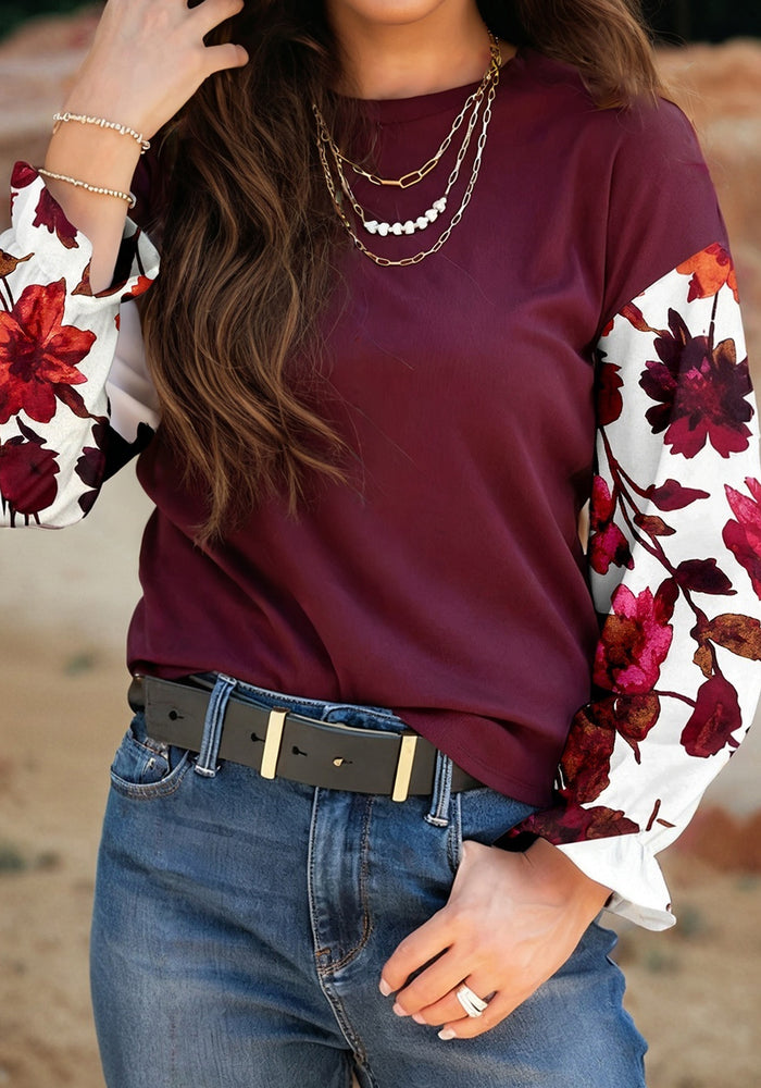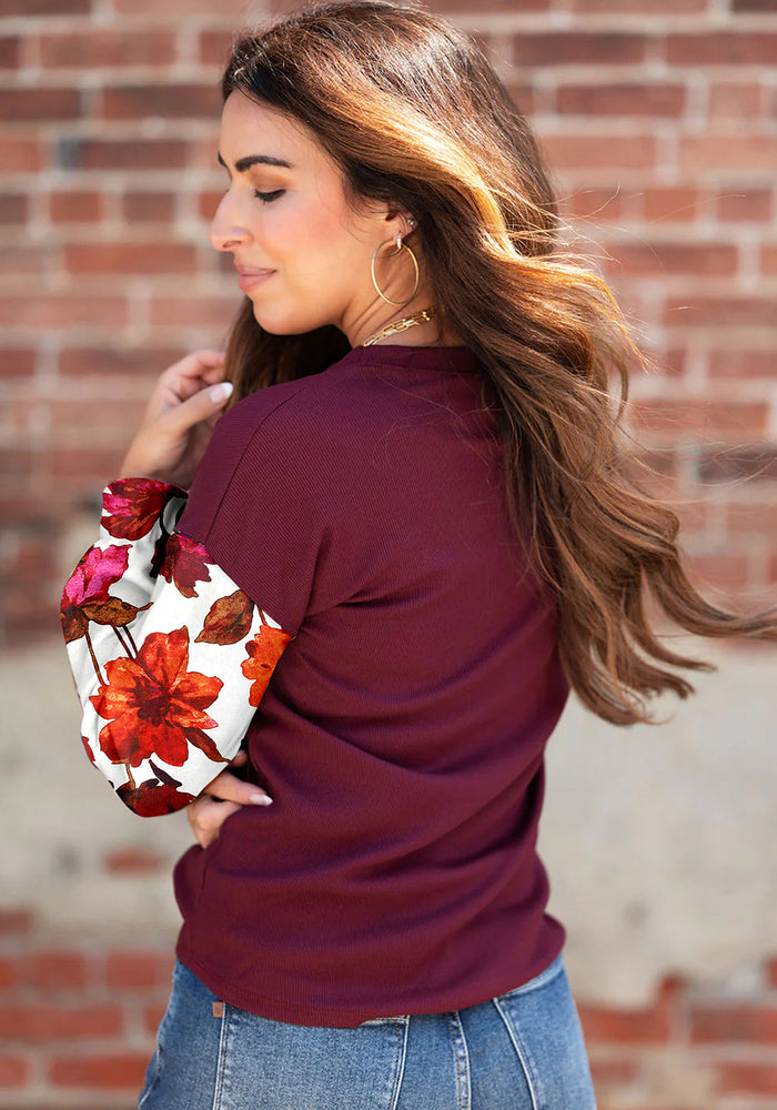 Wild Ginger Contrast Floral Sleeve Solid Ribbed Body Patchwork Long Sleeve Top